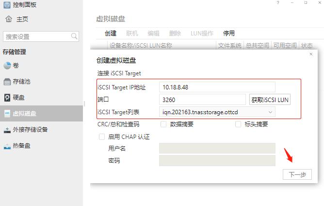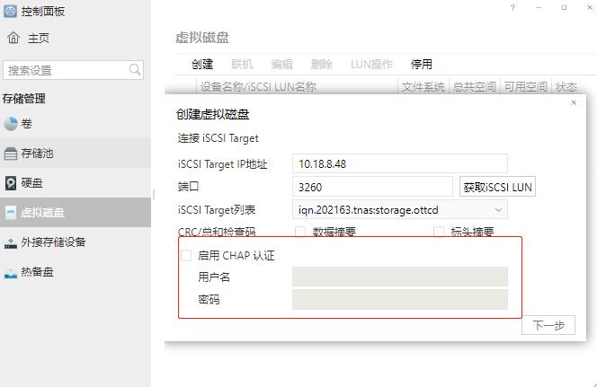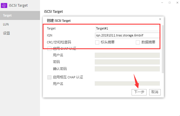 6.如有启用CHAP认证,请输入CHAP认证信息,点击下一步(你可以选择启用“数据摘要”或“标头摘要”,这些选项将被设定为iSCSI initiator 联机iSCSI Target时需要验证的项目);
