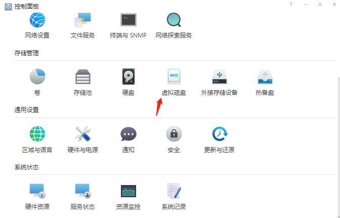 2.添加虚拟磁盘,前往TOS桌面-控制面板–存储管理-虚拟磁盘;