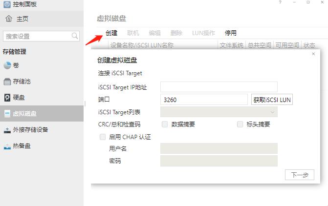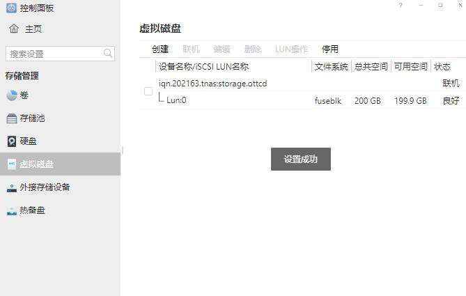 1.要为TNAS挂载虚拟磁盘,在执行该操作前需要在其它NAS设备或服务器上先创建好iSCSI Target;