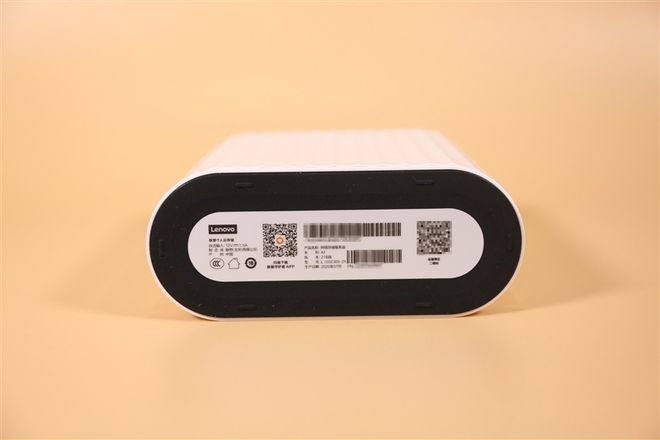 底部一圈橡胶垫,保证放置平稳不打滑。根据标签可知,联想个人云存储A1的工作最大功率为18W,另有管理APP的下载二维码和设备配对二维码也都印刷于此。
