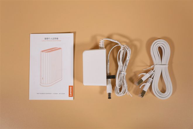 除了联想个人云存储A1本体外,包装中还有一本使用说明书,一个电源适配器,一根六类网线。