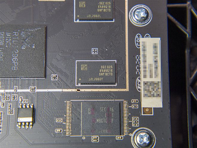 取下主板部位的散热片,可以看到下方的芯片信息,内存颗粒为三星K4A4G165WF BCTD,单颗512MB,共两颗,总容量1GB。闪存颗粒型号为KLM8G1GETF-B041,单颗容量8GB。