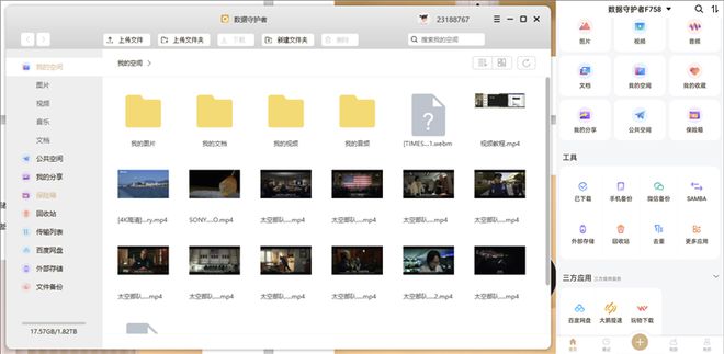 管理软件支持Windows、iOS、安卓、安卓TV、macOS五个平台,实现了使用场景的全覆盖。支持多人共用,公共、私密空间创建及管理,采用SDVN虚拟安全网保证数据传输安全。拥有百度网盘、玩物下载等第三方应用,可以与网盘资源链接,也支持离线下载功能。支持Samba协议,实现文件在支持设备间的完全共享。甚至,它还有分享功能,你不仅可以将文件分享给个人云下的其他成员,还可以用微信以及链接的形式将文件分享。
