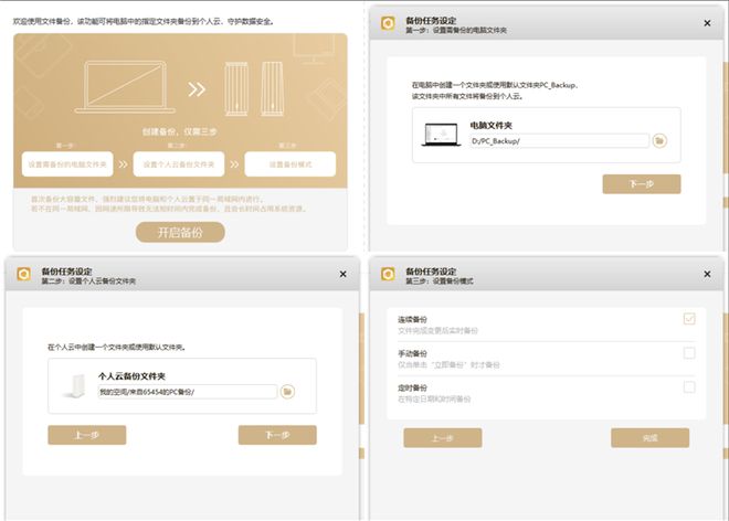 PC端也同样支持备份功能,不过需要自行创建/选择文件夹使用,可以设置连续备份、手动备份、定时备份三种备份策略。
