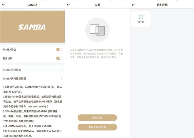 一些功能仅在手机端提供,比如Samba协议的控制界面、去重功能以及扫一扫。