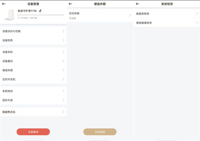 设置功能也是手机APP端更为详细,可以设置硬盘休眠、定时关机还有进行数据库检测、磁盘检测等系统维护。