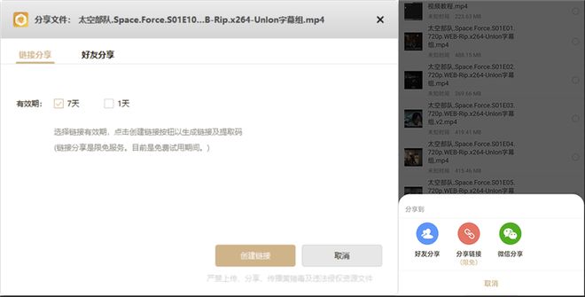 将文件分享给外人也十分方便,提供了链接分享、微信分享等多个选择,还有第三方插件,比如百度网盘、玩物下载等,可以大大扩展适用面,也带来了离线下载这一十分方便的功能。