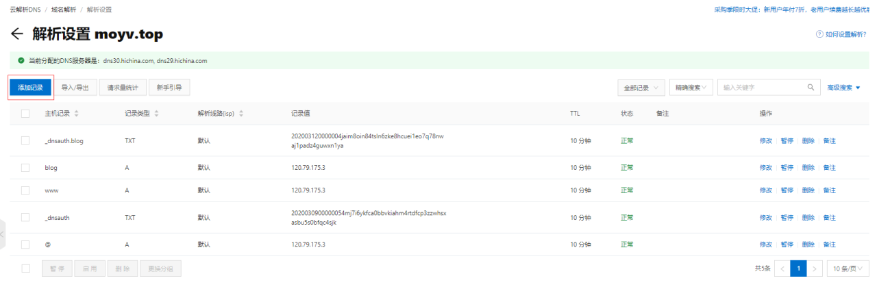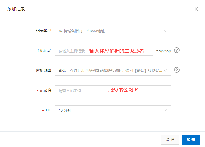 <VirtualHost *:80> ServerAdmin root@localhost ServerName blog.moyv.top #填写你的二级域名 DocumentRoot "/var/www/html2" #填写你刚刚新建的站点目录 <Directory "/var/www/html2"> #填写你刚刚新建的站点目录 Options Indexes FollowSymLinks AllowOverride All Require all granted </Directory> </VirtualHost>