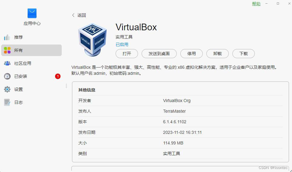 2.登录铁威马TOS系统,打开应用中心,下载并安装VirtualBox;