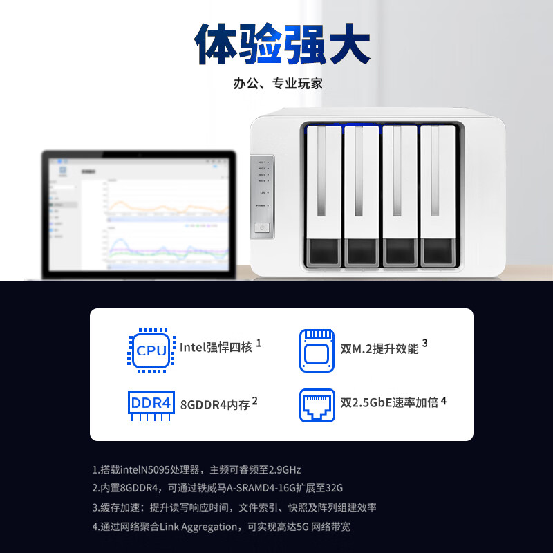 搭载Intel N5095处理器和8GB DDR4内存,F4-423(8G) NAS存储确保了流畅高效的运行体验,无论是日常办公还是专业应用都能应对自如。