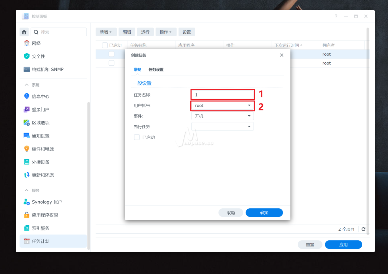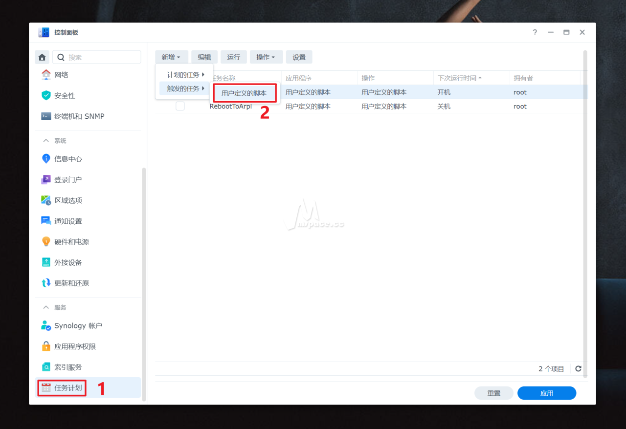 控制面板 – 计划任务 – 新增 – 触发的任务 – 用户定义的脚本