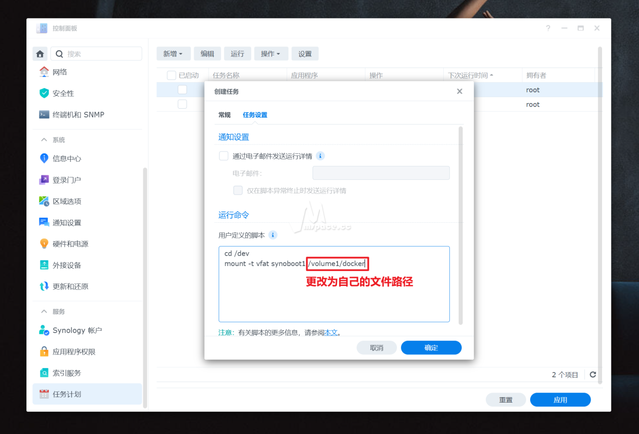 将以下代码添加进任务设置后保存,默认是 1 号存储池的 docker 文件夹,如果路径不对则需要更改成自己的文件夹路径