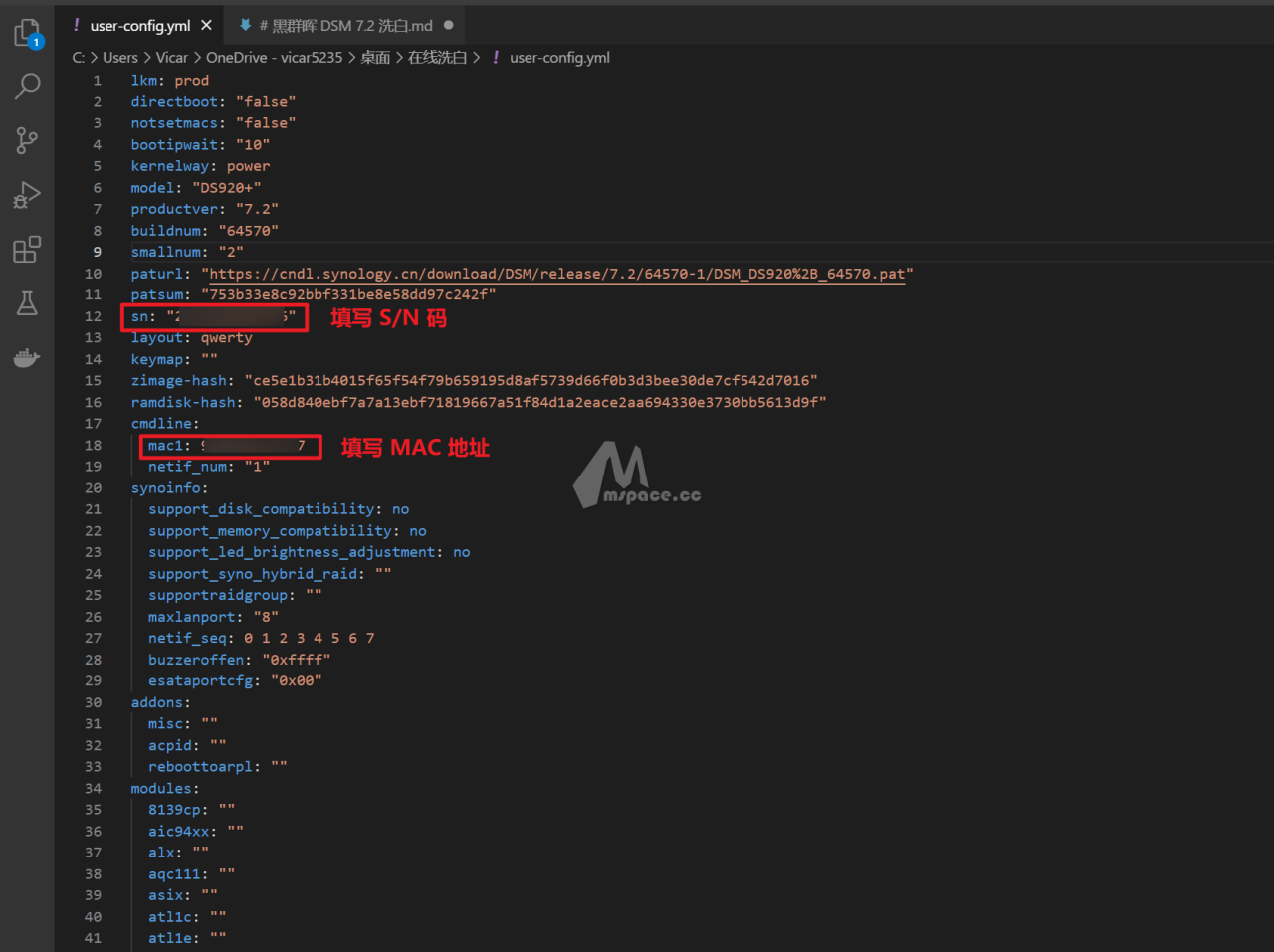 打开 user-config.yml 文件,修改 S/N 码和 MAC 地址后保存