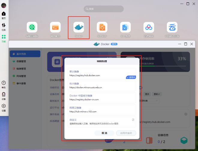 很贴心的是,绿联云上的docker界面也是经过重新设计的,操作体验都更简单了。例如在docker界面的镜像源设置里更换镜像,目前有默认、网易、中国官方、网易云等;在安装容器的时候还提供了“手把手教”的安装教程,小白也可以跟着教程简单折腾出一些有意思的玩法。