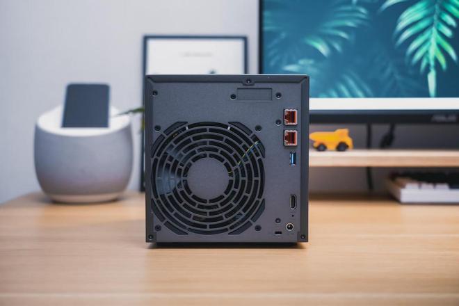 华硕AS6704T背部采用了2个2.5GbE网口,上方还可以扩充一张10Gbps万兆网卡,有一个USB3.0接口,一个HDMI接口,接口配置十分丰富。