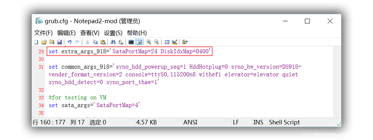 1 # /grub/grub.conf 2 # 从第31行开始 3 ...... 4 set extra_args_918='' 5 6 set common_args_918='syno_hdd_powerup_seq=0 HddHotplug=0 syno_hw_version=DS918+ vender_format_version=2 console=ttyS0,115200n8 withefi elevator=elevator quiet syno_port_thaw=1' 7 # for testing on VM 8 set sata_args='SataPortMap=24 DiskIdxMap=1000'# 将两项加在这后面(10,00都为16进制) 9 ......