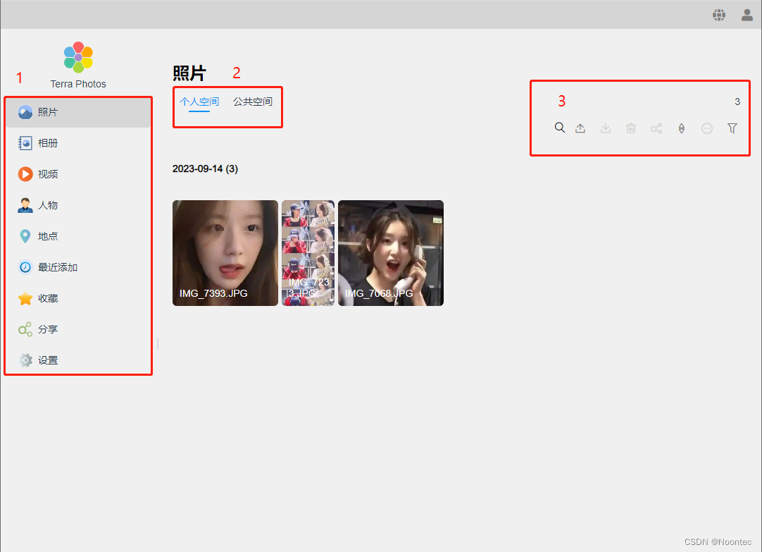 打开Terra Photos,页面如图所示,我们主要分以下三大板块和大家介绍Terra Photos,一是功能模块,二是照片存放空间,三是操作区域