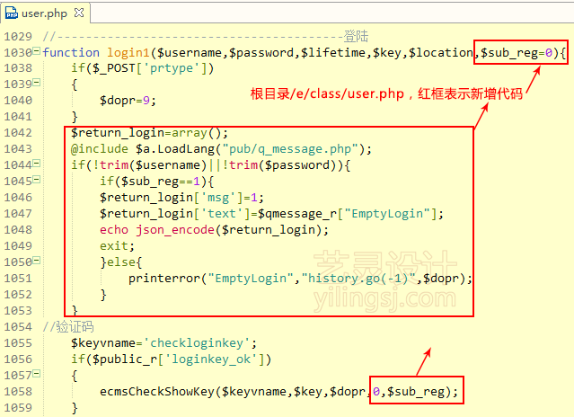文件地址:根目录/e/class/user.php,找到登陆,大约在1030行,新增以下代码。