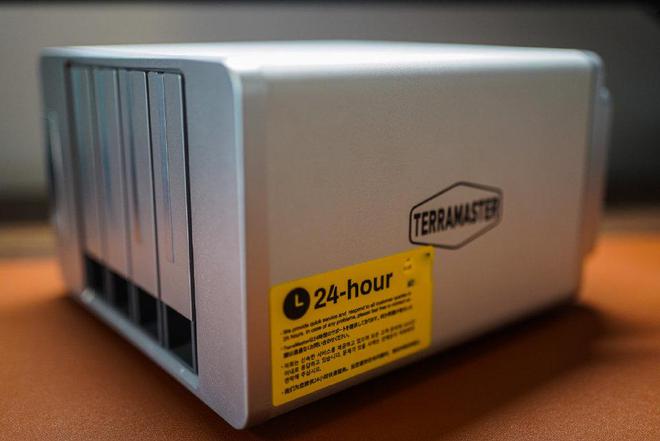 在侧面,光滑的金属外壳上,印有Terra Master也就是铁威马的品牌logo,设计语言非常简洁,而背后则是24小时数据援助的承诺,直接写在机身上,安全感满满。