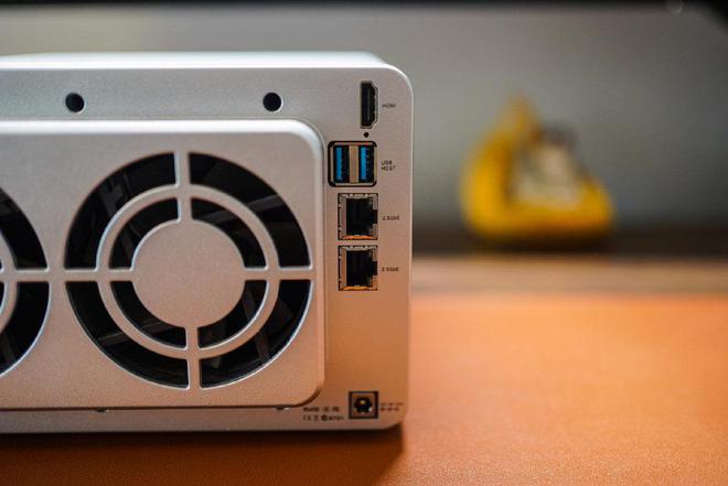 这台铁威马背后藏了一个小“屁股”,其实里面藏着两张散热风扇,温度控制非常稳健。另外一边的接口可以说很齐全,包括电源接口、2个2.5GbE网口、2个USB 3.0接口,以及1个HDMI 2.0口。发烧友的需求,基本都给管上了。