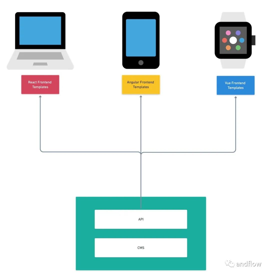 Headless CMS架构似乎与解耦CMS架构基本相同。但解耦的CMS架构使用默认的前端内容发布平台。然而,Headless CMS架构则可以完全自由地选择想要的前端技术。并没有提供标准模板或预定义模块集成的前端系统。