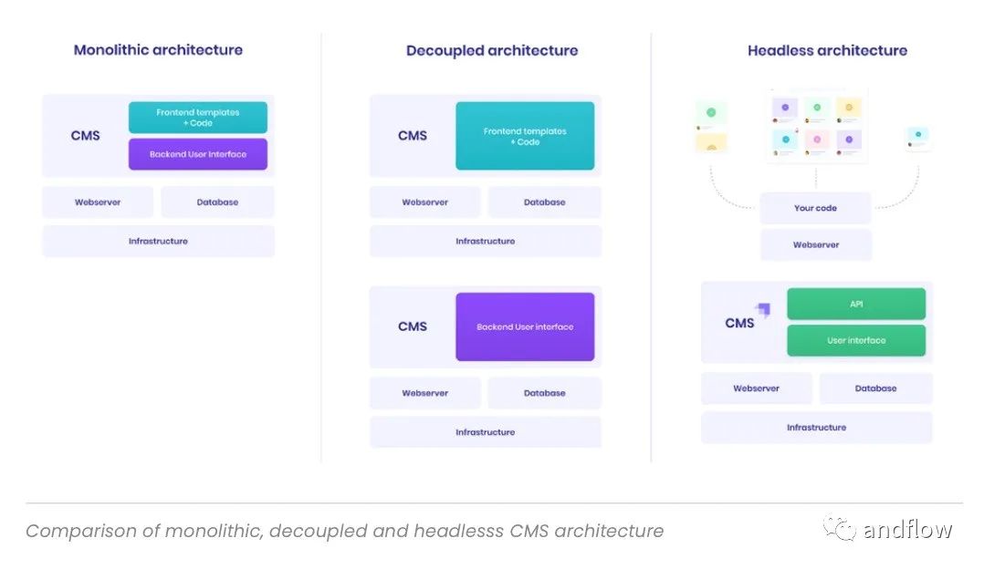 CMS的架构核心都包含了管理前端内容呈现的功能以及后端内容创建与编辑的功能。但随着信息技术的发展,CMS的架构也不断地演化。