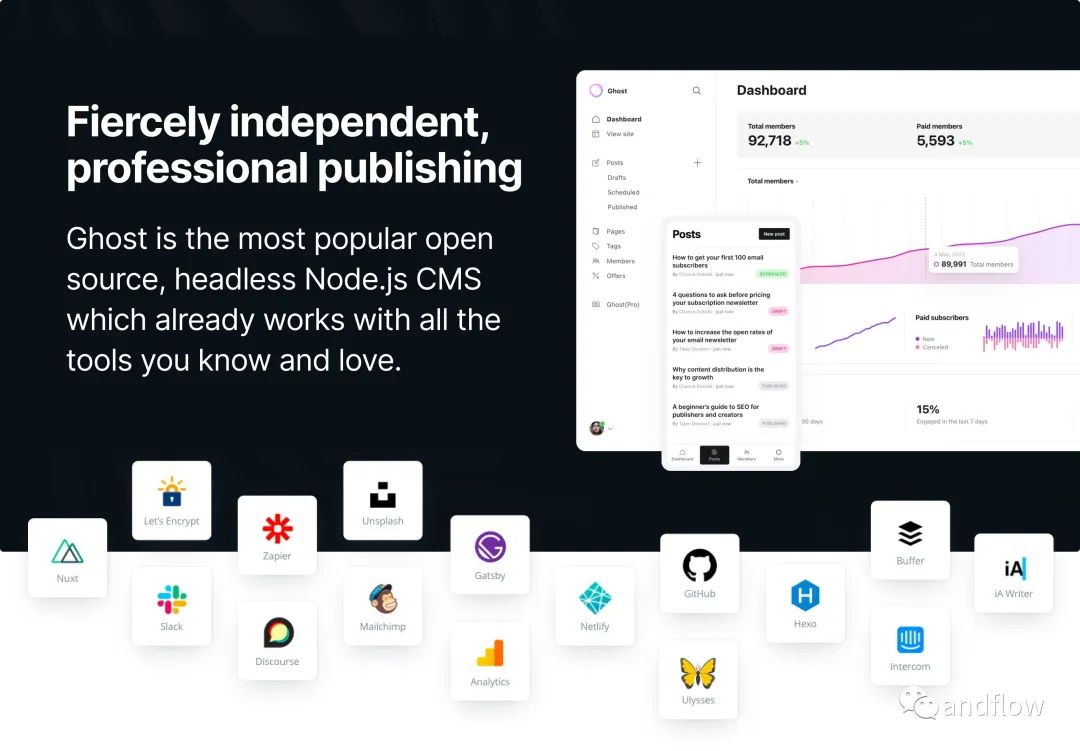 Ghost是一个专业的博客开源发布平台。Ghost支持自定义主题,支持Markdown语法,并提供了一个强大的编辑器,可用于编写和格式化博客文章。Ghost以性能而闻名,是博主和内容创作者的热门选择。