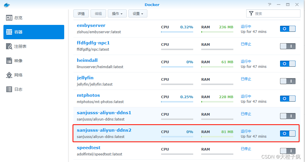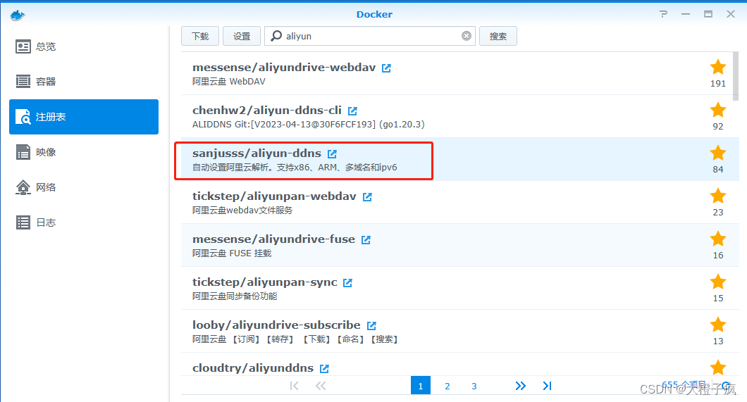 上面通过群晖自带的DDNS接口好像只能更新IPv4的值(我自己尝试了没更新上去),如果用的是公网IPv6,那么可以采用docker安装aliyun-ddns更新阿里云域名,这一个方式适合所有可以安装docker的设备或系统,不止是群晖nas。
