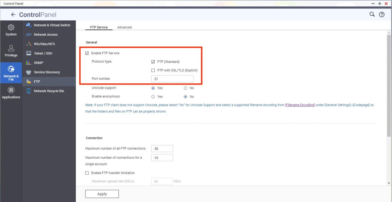 转到“Control Panel”(控制台)>“Network & File Services”(网络 & 文件服务)> FTP。