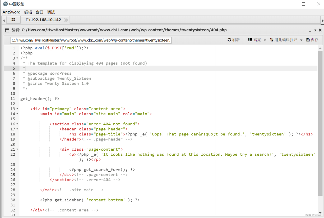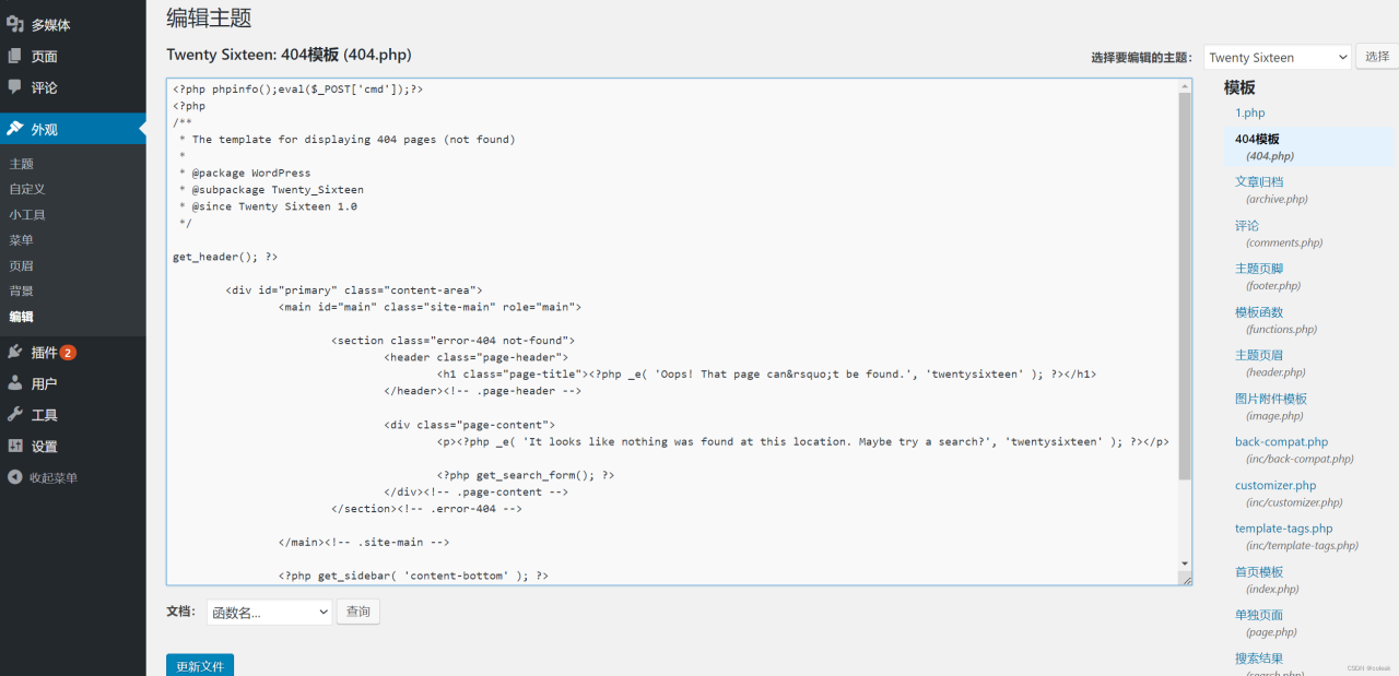 登录后在外观的编辑里面找一个模板,我们在404模板 (404.php)里面写入一句话后门