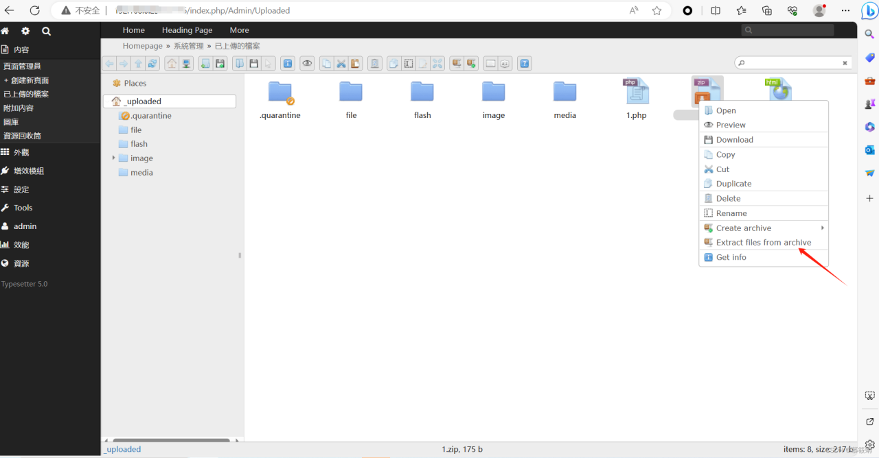 在Typesetter CMS Typesetter CMS 5.*,<=5.1的版本中,存在代码问题漏洞,该漏洞源于允许管理员通过ZIP归档中的. PHP文件上传和执行任意PHP代码。