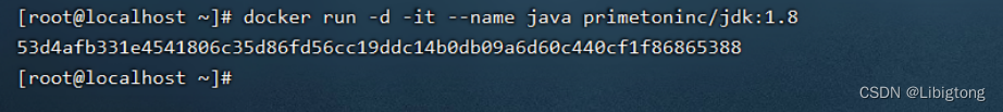 docker run -d -it --name java primetoninc/jdk:1.8 参数说明: run:启动一个镜像容器 -d:指定容器运行于后台 -it:-i 和 -t 的缩写; -i:以交互模式运行容器,通常与 -t 同时使用 -t:为容器重新分配一个伪输入终端,通常与 -i 同时使用 --name:第一个“java”是为容器指定了一个别名,而第二个“java”指的是下载镜像时的名称