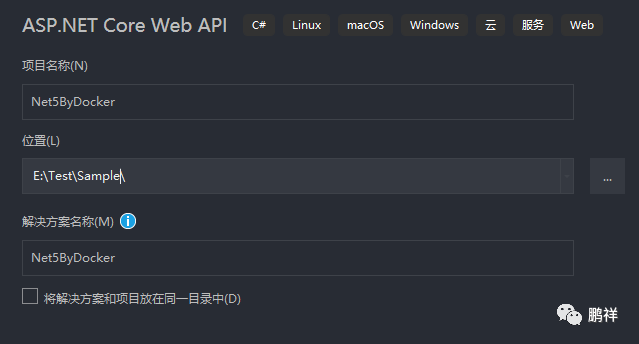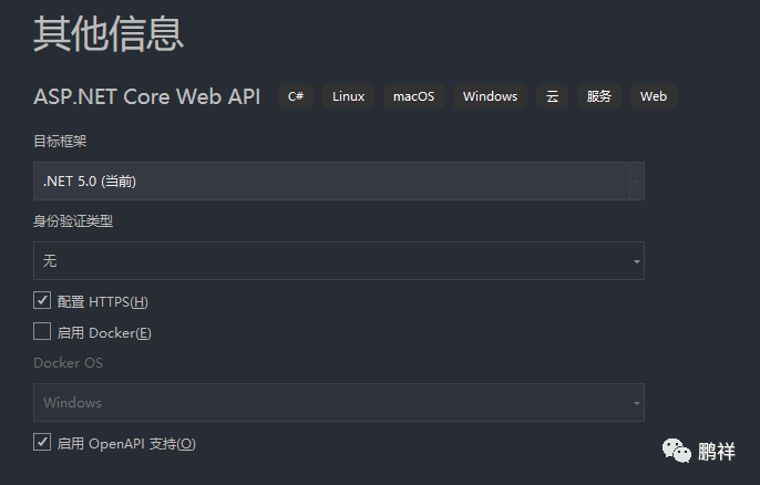目标框架是.Net5,无需身份验证,不配置HTTPS(根据个人需求勾选),启动Docker(我习惯于后期添加),启用OpenAPI支持(添加swagger文档)