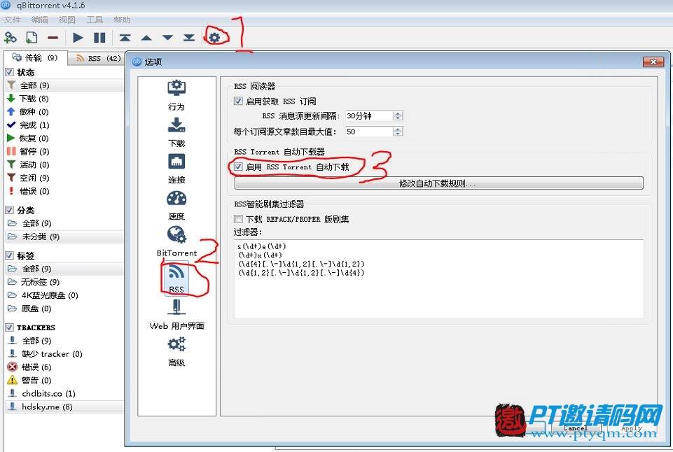 首先启用RSS自动下载,打开设置–RSS–启用RSS Torrent 自动下载。