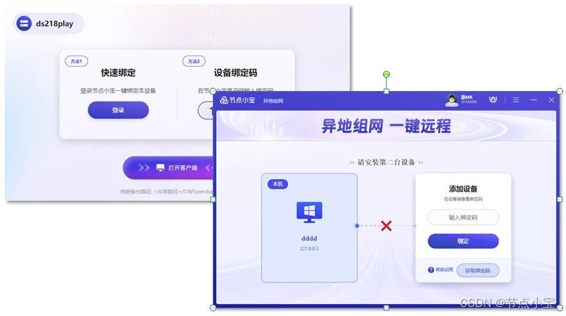 两台设备登录同一个节点小宝账号或者输入设备绑定码,即可完成组网。建议两台主机进行组网。